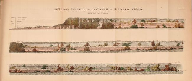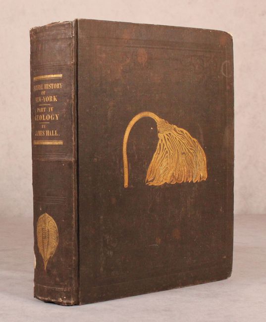 The map is bound into the 683 page report, including 34 plates of tables with figure drawings of fossils; 24 lithographed plates of views, profiles and sections, including 4 b&w (3 folding), 8 tinted views, 12 folding, hand colored geologic profiles and the large, folding hand colored geologic map of the middle and western states. Quarto, hardbound in brown cloth with gilt decorations on front cover and gilt title on spine.