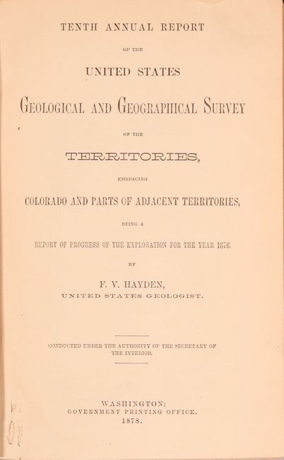 This classic work documents the journeys of Hayden's field parties through parts of Colorado and New Mexico in 1876. It was the most richly illustrated annual report issued to date including, for the first time, tinted lithographs and true chromolithographic maps. The three large, color folding maps (35x25") found at the end of the volume include: