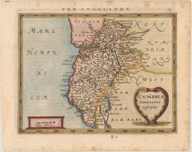 This map depicts the county of Cumbria in northern England along the Irish Sea. Hadrian's Wall is prominently depicted. German text on verso. This map is rare as it only appeared in two editions of the Atlas Minor.