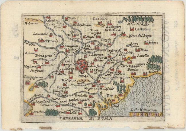 This charming miniature map is centered on Rome with north oriented to the left. The map depicts the rivers, towns, and topography in the surrounding province. Pietro Maria Marchetti produced the second pocket atlas based on Abraham Ortelius' folio Theatrum. It is often referred to as the plagiarized version of the Epitome. The copper plates are closely copied from those of Philip Galle's 1593 Italian edition. Italian text on verso.