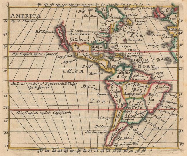 Morden's small map of the western hemisphere shows the island of California on the second Sanson model. There is little detail in the interior of North America with only a few cities and states named. The entire region west of the Mississippi River is labeled Nova Mexicana while Mexico and Central America are Nova Hispania. Only two of the Great Lakes are shown, and the northwest coast of North America is left blank. This is the third state, with the lines of longitude at bottom declining from 368 degrees. On a full sheet of English text measuring 6.2 x 7.9".