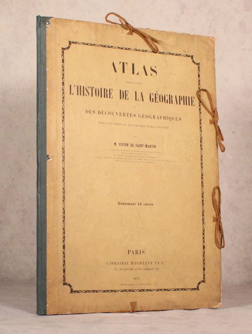 This complete historical atlas includes numerous maps of the world and regional views on twelve sheets from ancient times, the Middle Ages, and the modern era. It includes two world maps on a Mercator Projection showing the extent of discoveries in 1491 and 1550, as well as a reprint of Ortelius' world map of 1587. Includes 4 pages of explanatory text. Published by Librairie Hachette in Paris. The maps are issued loose in a portfolio with four ribbon ties securing the stiff boards together.