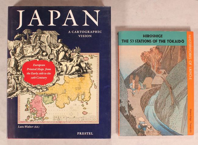 A. Japan - A Cartographic Vision - European Printed Maps from the Early 16th to the 19th Century, by Lutz Walter, published 1994 (9.8 x 12.5"). This terrific reference focuses on the changes in the way Japan was seen by Western explorers and cartographers, from the speculative and incorrect depictions of the early sixteenth century to the first accurate maps published in the mid-nineteenth century. It includes eleven essays, each illustrated with portraits, drawings, contemporary views, and maps. The plates are followed by a catalogue of 128 items, with detailed notes on the plates. Edited by Lutz Walter on behalf of the German East-Asiatic Society, on the occasion of its 120th anniversary. 232 pages with 265 illustrations, 182 in color. Hardbound in red cloth with an illustrated dust jacket. Condition: Slight sunning along the spine of the dust jacket, otherwise like new. (A)