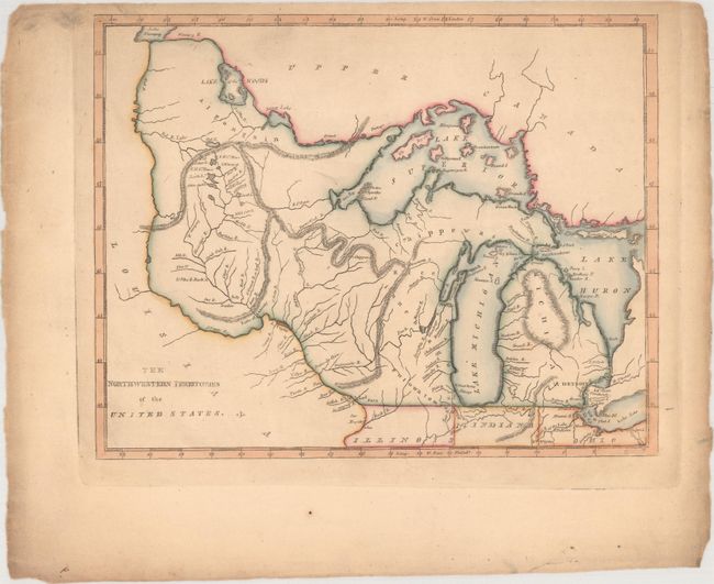 This map covers the region from Michigan through Lake of the Woods and Lake Winnipeg. The Great Lakes are slightly distorted and include the spurious islands in Lake Superior including one named Phillipeaux I. The map names Michigan, Illinois, Indiana, Ohio, and the settlements of Detroit, Sandwich, Miami B., F. St. Claire, F. Dearborne, Chicago, and more. The northern border of Illinois is shown level with the top of Indiana at 42°, which places Chicago in the Northwestern Territory. Spurious mountain ranges, engraved in hachure, are shown snaking across the territory.