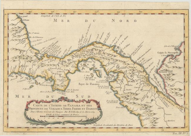An attractive, small map featuring good detail of Panama many years before the creation of the Canal and Lake Bayano. Numerous place names including S. Yago on the Azuevo Peninsula, Portobelo, Se. Marie, Panama, etc. Extends to include the Gulf of Darien. Adorned with a delicate title cartouche. This map was published in Antoine Francois Prevost d'Exiles' influential collection of travel narratives, L'Histoire Generale des Voyages.