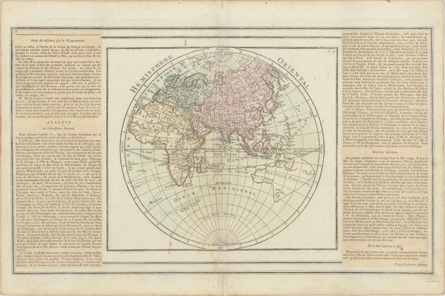 Pair of very attractive hemisphere maps, each surrounded in plain border with that was printed from a separate copper plate. In the Western Hemisphere, Brion has devised an ingenious way to show the competing theories of the Pacific Northwest. One hypothesis is engraved in dotted lines and colored in green, and another version, engraved in hachure and colored in yellow, shows the Sea of the West and Northwest Passage. In the Eastern Hemisphere, Australia is partially mapped and then completed into an odd shape by hachures connecting Tasmania and New Guinea. Both maps include numerous explorers' routes and important recent discoveries. Each sheet measures 18.8 x 11.0" with the panels of French text, which were printed on separate sheets and pasted adjacent to the maps. Brion de la Tour's Atlas General et Elementaire was first published in 1766, with subsequent editions in 1767, 1768, 1778, 1782, and 1786.