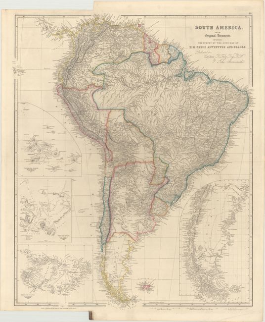 In Arrowsmith's fashion, this is a remarkably detailed and finely engraved chart of the continent. It is absolutely filled with topographical detail throughout the interior, hundreds of towns and villages, and an amazing amount of information along the coastlines. Insets of the Galapagos Islands, Port San Carlos, Falkland Islands, and a large inset that delineates Patagonia with more detail than possible on the main map. Three distance scales are provided: English miles, and Spanish and Portuguese leagues.