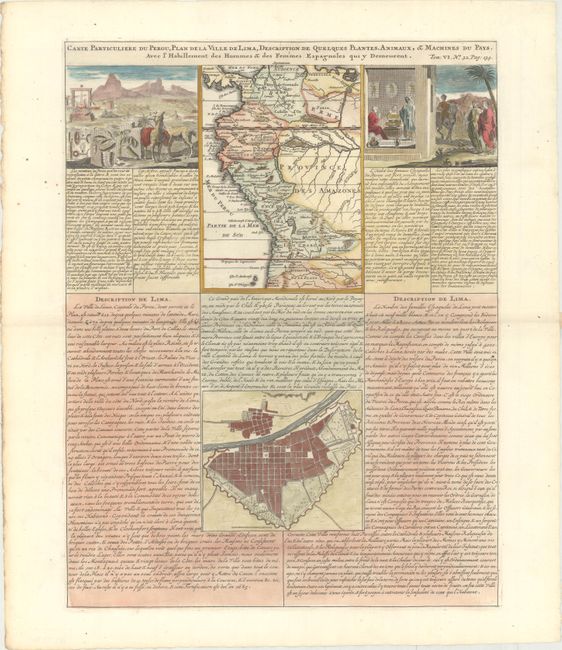 This interesting folio sheet contains two maps and two engravings surrounded by panels of French text. The top map covers the northwest coast of South America from Panama to northernmost Chili, with detail of towns, rivers, and mountain ranges. The map is flanked by two engravings depicting the people, tools, animals, and plants of the region. At bottom is a bird's-eye plan of Lima showing its fortifications.