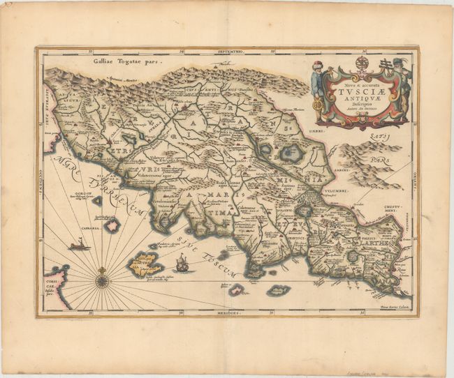 Pieter Van Den Keere (Petrus Kaerius) engraved this attractive map of ancient Tuscany. It is based on Ortelius’ map that was in turn based on Bellarmati's map supplemented by classical sources. The map is very detailed and includes the coastal islands. It locates the major Etruscan and Roman settlements and the Roman roads. The map is embellished with surveyors flanking the title cartouche, a compass rose, and sailing ships.