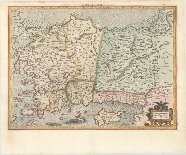 A fine Ptolemaic map of Turkey and Cyprus showing its ancient political divisions. The map is adorned with a strapwork title cartouche and two fierce sea monsters in the Mediterranean Sea. Mercator originally published this map in his 1578 edition of Ptolemy's great Geography. Although he is most renowned today for the projection he popularized and for first using the term Atlas for a collection of maps, he devoted much of his life to his Ptolemaic maps. The maps were beautifully engraved as nearly as possible to their original form and embellished with fine cartouches. This is the first state, published in Petrus Bertius' Theatrum Geographiae Veteris…, which included maps by Mercator and Ortelius. Latin text on verso.