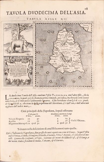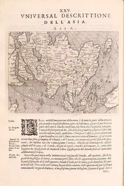 This complete, Italian edition of Ptolemy's Geographia was printed in Venice by the brothers Giovanni Battista and Giorgio Galignani. The translation of the text from Latin to Italian was completed by Leonardo Cerneti from Magini's 1596 work. The volume is divided into two parts with 64 total maps including both Ptolemaic (27) and modern maps (37). The modern maps consist of the world (3), Europe (22), Africa (2), Asia (9), and America (1). Among the many remarkable maps are the following: