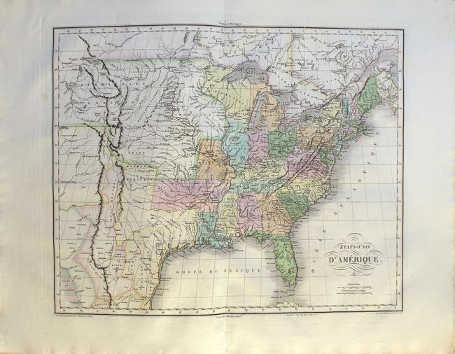 Etats-Unis d'Amerique (21.0 x 16.8"). This map is directly derived from John Melish's seminal map of the United States. The large Arkansas Territory takes in most of present-day Oklahoma; the new state of Missouri has a vertical western border; Michigan Territory includes most of present-day eastern Wisconsin; and the Northwest Territory takes in present day Wisconsin and Minnesota. The balance of the Midwest is included in the Territoire d'Oregon and is filled with information on numerous Indian tribes. The Grand Desert Americain takes in the southern plains region. Texas is a part of Mexico.