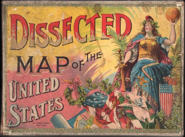 Terrific Victorian period map puzzle with original box. Complete with all 50 pieces, box, and full color map to aid in assembling the puzzle. This example was published sometime around 1890 or shortly thereafter given that Dakota Territory is now shown divided into the states of North and South Dakota. The original paper label on the box is reminiscent of a cigar box label as it combines the printing processes of multi-stone chromolithography, solid color zinc plate, and gold stamping to produce a beautiful image.