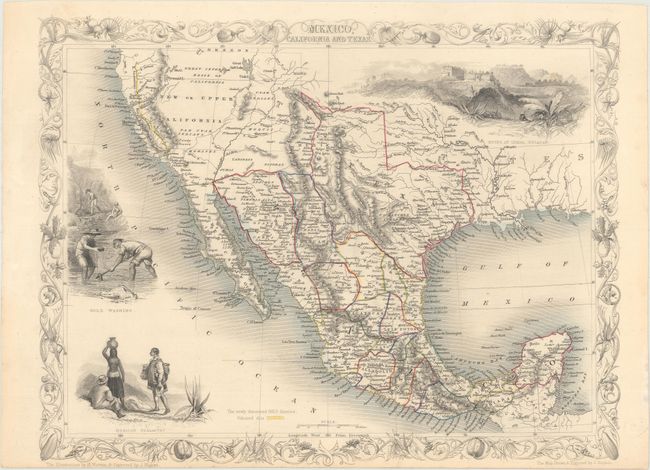 This is the second, and most desirable, state of this fine steel-engraved map that was issued during a time of great transition in the region. After gold was discovered in California, the plate was re-engraved to include a vignette of gold panning and to locate the gold regions of California which are delineated through hand coloring. Texas is shown with its original state borders that include much of present-day New Mexico and extend into Colorado. Two other vignettes show Mexican peasantry and the ancient Mayan ruins at Uxmal. The very decorative border incorporates native plants of the region. Map drawn and engraved by John Rapkin, vignettes drawn by H. Warren and engraved by J. Rogers.