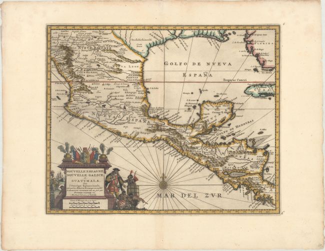 This decorative map of Central America depicts the majority of Mexico through Costa Rica, and extends to include part of the southern coastline of the US to Florida and Cuba. Cities, rivers, mountains and even volcanoes are illustrated. The title cartouche features a large architectural structure surmounted by weaponry, with Native Indians trading with a European on the right and a sailing ship in the background.