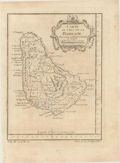 E. Carte de l'Isle de la Barbade... (5.8 x 7.8"). This small map of Barbados divides the island into eleven parishes with a well developed network of roads throughout. Condition: Light toning. (B+)