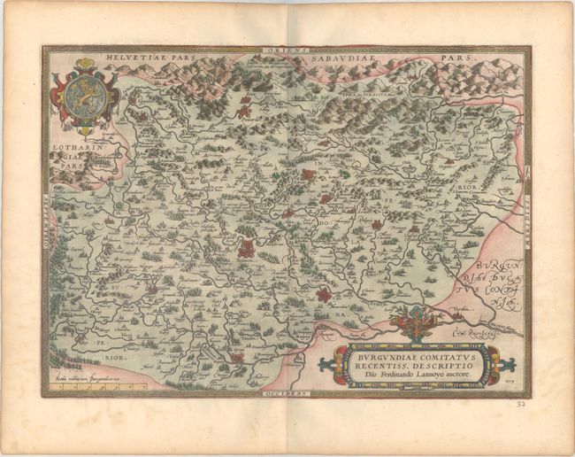 Handsome map of Burgundy based on the 1563 map of Ferdinand de Lannoy that was suppressed by the Spaniards for political reasons. The map is oriented with east at the top of the sheet and is filled with graphic illustrations of the rivers, mountains, forest, fortifications and cities. Embellished with a strapwork title cartouche and coat of arms. French text on verso, published in 1598.