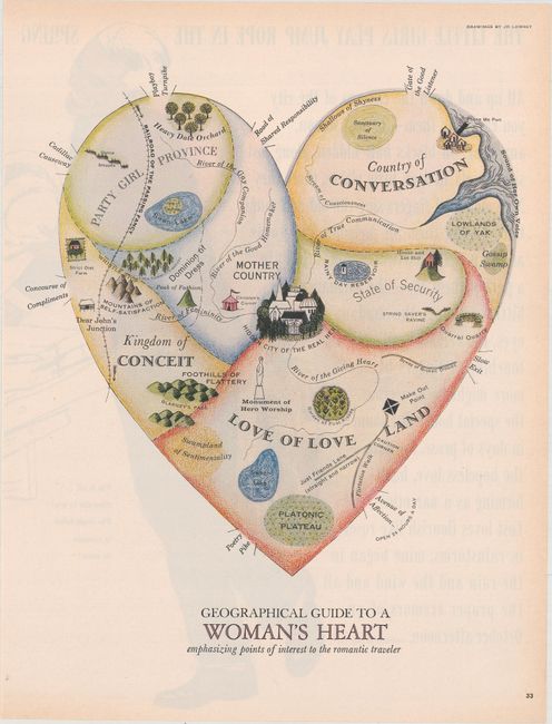 This matching pair of "geographical guides" depict a man's and a woman's heart, illuminating the social awareness of the time of the differences between the sexes with regards to love and relationships. The stark difference between the two begins even within the subtitles, with a man's described by "obstacles" and the woman's described as "romantic." The male heart is divided into regions such as State of Solid Comfort, State of Superiority, Country of Freewheeling and Area of Appetite, while the female heart includes Love of Love Land, Country of Conversation, State of Security, and Party Girl Province. Humor and stereotypes abound in these fanciful hearts, which were created by Jo Lowrey and published in the January 1960 issue of McCall's Magazine. These hearts were based on similar Victorian-era maps by the Kellogg Brothers of Connecticut. On the verso of the man's heart is a short article about the characteristics a man looks for in a woman.