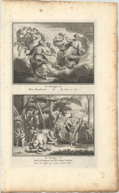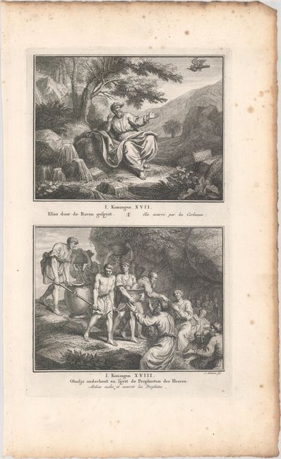 Nice lot of copper engraved illustrations from the Old Testament depicting various scenes from the Book of Kings. Illustrations include the Judgment of Solomon, the Queen of Sheba visiting Solomon, Obadiah hiding and feeding the "hundred prophets," Elisha and the two bears, Jezebel's death, and others. There are two scenes (7 x 5.3") on each sheet, for a total of 16 engravings. They are from a Dutch biblical history by Ysbrand van Hamelsveld.