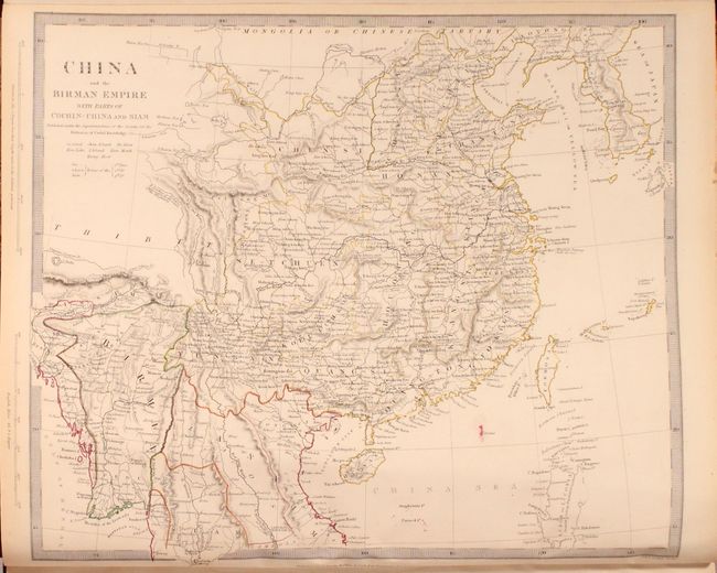 This atlas compiles classic SDUK maps of Europe and Asia and includes an index. It was published by George Cox, who purchased the SDUK plates from Charles Knight in 1852. The table of contents lists 112 maps, 66 of which are included in this particular example. The maps included are the world on gnomonic projection (6); England (5); Scotland (3); ancient Britain (2); the Netherlands (1); France, modern and ancient (5); Italy, modern and ancient (6); Corsica and Sardinia, with the Balearic Islands and Malta (1); Spain (3); Portugal (1); Germany and Austrian Dominions (6); Poland (1); Scandinavia (3); Russia (1); Turkey and ancient Greece (6); Asia Minor (2); Persia, ancient and modern (2); India (11); and China (1). Hardbound in quarter leather with tips over marbled-paper covered boards and gilt titling on spine.