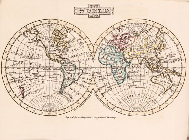The Geographical Dictionary contains 7 folding maps of the world, solar system, Africa, South America, North America, Asia, and Europe. The world map shows Tasmania still attached to Australia, however the rest of the world is fairly accurately portrayed, including the Alaskan coastline. The North America map most notably contains a River of the West, extending from Juan de Fuca and almost connecting to several rivers west of the Great Lakes, reminiscent of the elusive northwest passage. Cartographically, the United States is confined to east of the Mississippi River, Florida is divided into East and West and both are still a Spanish possession, and Texas is named. The book includes dictionary-style descriptions of historical anecdotes and the most important places within the four continents. Unpaginated, but of similar size to the first volume.