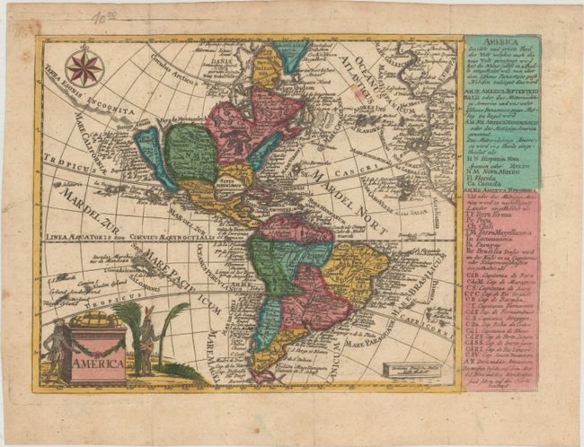 This small and handsome map depicts North and South America, with California shown as an island and the Great Lakes depicted as an amorphous body of water. The Missouri River appears as an unusual waterway with three small lakes named Fl. Marlis Moingona (on the first state the name is Fl. Mortis Moingona) branching off the Mississippi and emptying into the Mare Vermeio. The Strait of Anian is shown in the Pacific Northwest, separating a large Terra Esonis Incognita from California. There are numerous, meticulously engraved place names throughout the map, including Quivira and Grand Teguaio in the west. The title cartouche is surrounded by native figures and products of the Americas. This is the second state, with variations in the cartouche and text at bottom right.