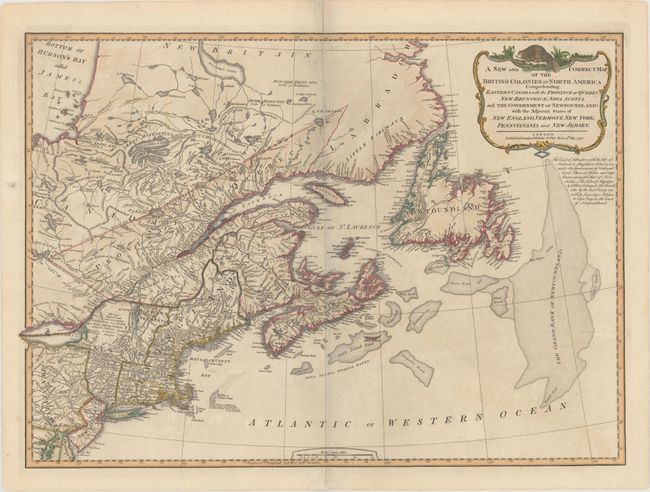 This detailed map includes eastern Canada with Quebec, New Brunswick, Nova Scotia, and Newfoundland together with New England, New York, New Jersey and parts of Pennsylvania, Maryland and Delaware. The great fishing banks are graphically depicted. There are numerous interesting notations throughout, e.g., "This vast Tract of Land, which is the Antient Couchsachrage one of the Four Beaver-Hunting Countries of the Six Nations, is not yet Surveyed" and "Col. Arnold's Rout [sic] in 1775" referring to Benedict Arnold's winter campaign at the start of the American Revolution. The title cartouche is surmounted by a beaver.