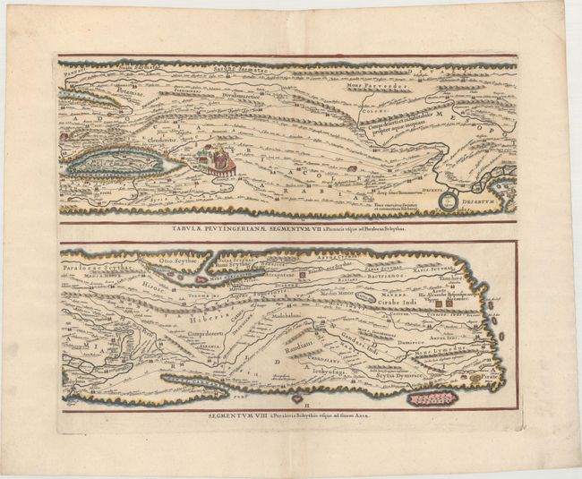 Four sheets making up the famous Peutinger Table, or a Roman road map of the world. The original parchment document was found by Konrad Celtes in a library in Augsburg, came into the hands of Konrad Peutinger and later went to his relative Mark Welser who was the first to publish a copy of it in 1591 at Aldus Manutius in Venice. These maps, based on the original manuscript, were first popularized by Ortelius in 1598 and became an important part of his great historical atlas. Jansson's version is nearly identical to that of Ortelius. These decorative maps, in a sequence of four plates, each with two strip maps, depict the imperial roads and posts within the Roman Empire throughout Europe, North Africa and Asia as far as Toprobana (Sri Lanka). Blank verso, published in Pieter de Hondt's Description Exacte de l'Univers, ou l'Ancienne Geographie Sacree et Profane, a French edition of Georgius Hornius' Accuratissima Orbis Antiqui Delineatio, which included maps from Johannes Jansson's historical atlas and Abraham Ortelius' Parergon.