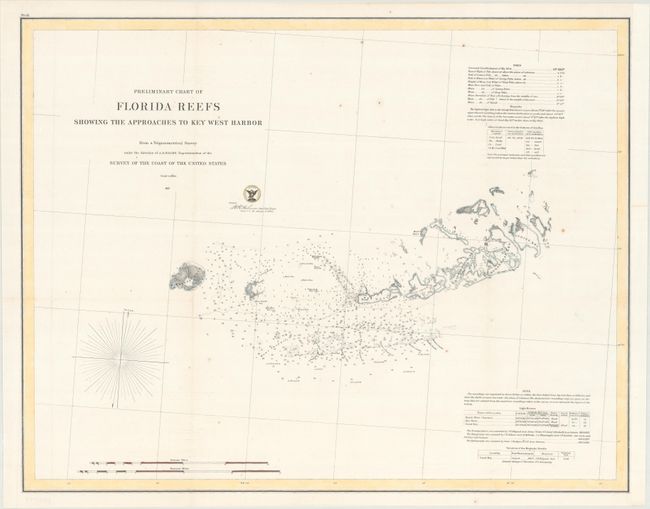 B. Preliminary Chart of Florida Reefs Showing the Approaches to Key West Harbor, dated 1857, hand color (22.7 x 17.8"). This chart zooms in on the westernmost Florida Keys, spanning from Cudjoe Key across the Boca Grande Channel to Marquesas Keys. There is little inland detail, but the waters surrounding the key are dense with navigational information. Three lighthouses are located.