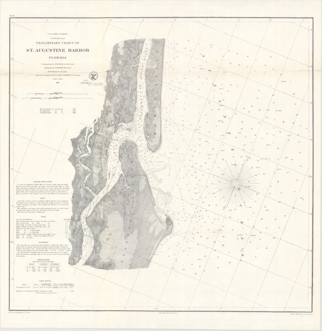 C. Preliminary Chart of St. Augustine Harbor Florida, dated 1862, black & white (21.4 x 20.7"). This intricately detailed coastal chart centers on St. Augustine, shown here in miniature plan form. The chart extends to include the northern part of Anastasia Island and Vilano Beach, here labeled North Beach. There is terrific topographical detail on land. It identifies Fort Marion, the St. Augustine Lighthouse, and the Tolomato and Matanzas rivers.