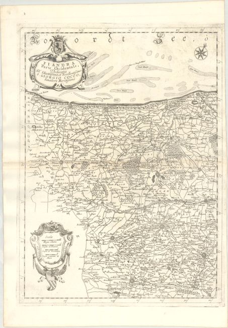 A. Flandra Parte Occidentale..., (17.7 x 24.1"). This map extends along the coast from Calais, France to Oostende, Belgium, and as far inland as Douai. The map is adorned with two strapwork cartouches and a compass rose orienting north to the top right.