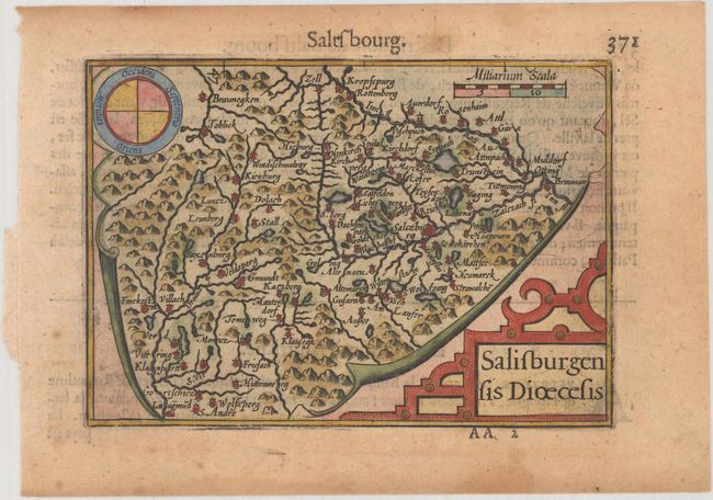 This miniature map shows the Diocese of Salzburg presented on the sheet within a scroll framework copied from Ortelius' map of the region. A unique compass rose orients the map with west at top. French text on verso.