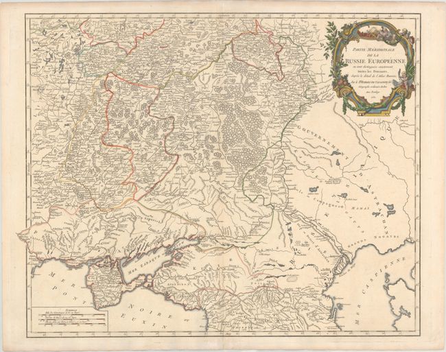 This large map is finely and fully engraved to show topographical detail of mountains, deserts, rivers and forests. Moscow is at upper center. The map extends to the Volga River in the east and south to show Georgia and parts of the Black and Caspian seas. It is decorated with a rococo-style title cartouche.