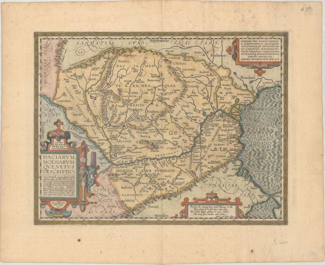 An early example of Ortelius' map of ancient Romania and Bulgaria compiled from the works of Dionos, Stephanus, Horatius, Suidas, Flavius Vopiscus, Plinius, and Strabo. The route of the Danube is noted to the Black Sea. The map is decorative with fully engraved seas and a trio of large cartouches. Italian text on verso, published in 1608 and 1612.