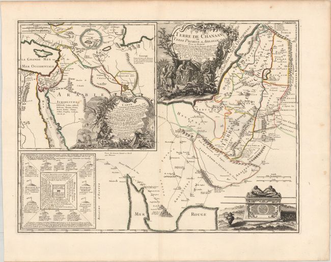 This decorative Holy Land map is based on the work of Guillaume Sanson. The main map traces the route of the Exodus and includes a plethora of Biblical and topographical details. It features a beautifully engraved title cartouche depicting the drunkenness of Noah and, at bottom right, the Ark of the Convenant. A large inset map at top left details Abraham's journey and includes a title cartouche showing the Lord's convenant with Abraham and the thwarted sacrifice of Isaac. Another inset at bottom left focuses on the encampments of the 12 Tribes, with the Tabernacle at the center. This is the first state. The map was engraved by Lattre, the cartouches by Gobin.