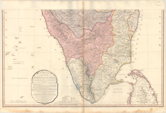 This impressive large-scale map illustrates a period when the British were consolidating their rule through various alliances with Indian kingdoms. The map, printed on two large sheets, covers the Indian subcontinent from Bombay (Mumbai) and Aurungabad, south to include the northern half of Sri Lanka (Ceylon). The routes of various military campaigns are highlighted in various colors and include the 1784 march of British Prisoners from Condapoor to Madras, the march of the Marquis of Cornwallis, the march of General Medows, and the march of General Abercromby. The acquisitions of the British and her Allies the Nizam and the Marhattas by the Partition Treaties of 1792 and 1799 vividly illustrate the growing domination of the East India Company. Compiled chiefly from papers communicated by the late Sir Archd. Campbell, the surveys of Col. Kelly, Capt. Pringle, Capt. Allan, etc. This is the third edition, first issued in 1793 and updated to 1800. The dimensions given are for each sheet; if joined, the map would measure 32.1 x 38.8".