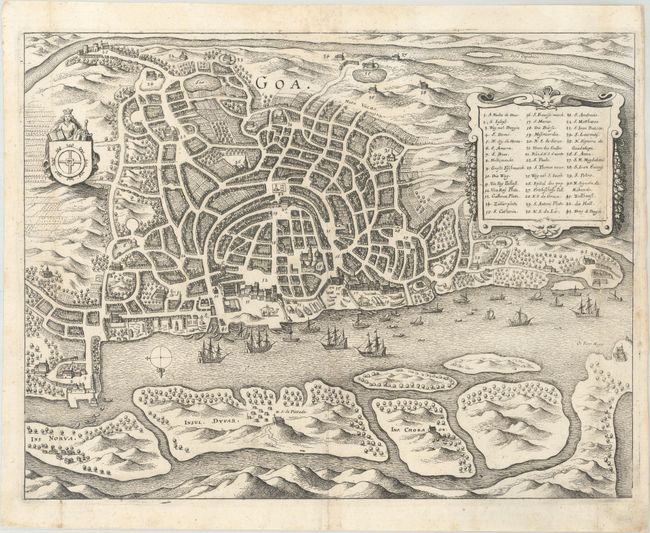 This is a sharply engraved view of the city of Goa, which was the largest trading center on India's western coast and Portugal's most important possession in India. A decorative cartouche encloses a numbered key to 43 locations within the city. North is oriented to the bottom of the chart. Elephants are shown working on the waterfront, and a number of ships sail in the bay. Published in Johann Ludwig Gottfried's Neuwe Archontologia Cosmica.