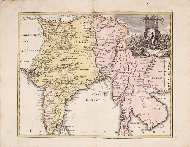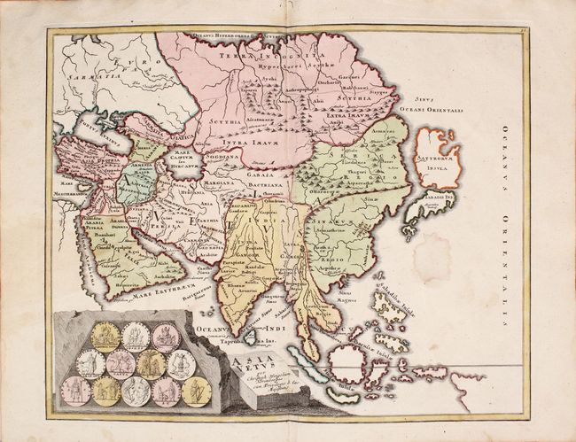 Christoph Weigel (1654-1725) was a goldsmith, engraver, illustrator, and publisher in Nuremberg, Germany, where he produced many maps and atlases of both the ancient and the modern world. Of particular interest is the fact that all his maps were hand-colored immediately after they were printed in his publishing house. The majority of early map publishers issued their maps in black and white with later coloring added by outside artists and colorists. Weigel's Descriptio Orbis Antiqui is an atlas of classical maps, most of which incorporate medallions or coins relating to the region depicted in the map. Included are 38 of the original 44 maps; the map of the Ancient World is completely missing, and 5 maps (Europe, Hispania, and three maps of Gallia), the title page, and the list of maps are essentially perished. The remaining maps are: