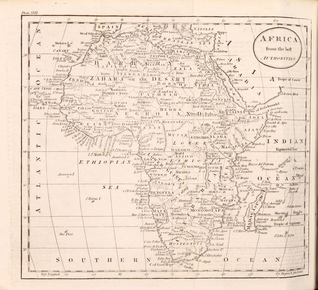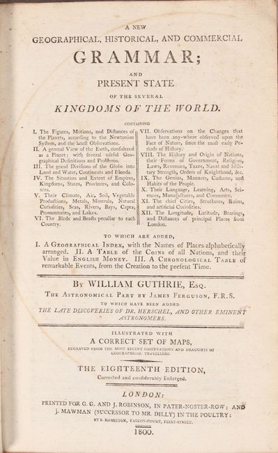 This thick octavo geography contains 26 folding maps including: 2 world maps; Europe; Sweden, Norway & Denmark; Northern Part of Russia in Europe; Scotland; England and Wales; Ireland; 2 maps of France; 2 maps of the Netherlands; Germany; Poland; Switzerland; Spain and Portugal; Italy; Turkey in Europe & Hungary; Asia; India; Africa; North America; British Colonies in North America; The United States of America; West Indies; and South America.