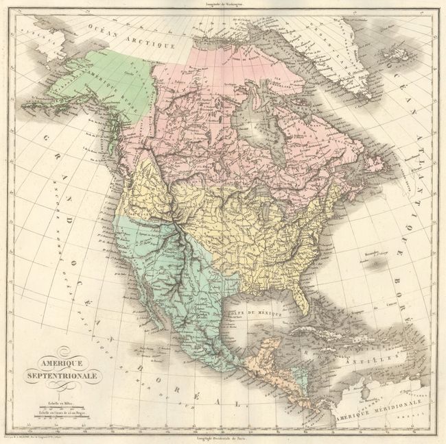This is the French edition of Carey & Lea's map of North America. It appears on a full sheet (26.8 x 20.6") with French text panels at sides and bottom describing history, geography, Indians, and more. The map shows the American Southwest under Mexican control. The United States extends to the Pacific Ocean and reaches far north into Canada showing the boundary that would initiate the Fifty-Four Forty or Fight dispute between England and the U.S. Alaska is Amerique Russe with good detail and place names along the coastal region, but a fully blank interior. Many Indian regions are noted throughout. In Texas (unnamed), only a few places are named; S. Antonio, Rancho, Matagorda, and San Saba. A bizarre mountain range diagonally crosses the Great Basin from Utah and nearly reaches the coast in the direction of San Clemente. The conjectural R. del Carmelo ou St. Phelipe, originating in L. Teguanyo ou Salo, freely runs through the Great Basin to its mouth at Monterrey. The states and territories of the United States are delineated with Arkansas and three unnamed areas to the north. Engraved by B. de Beaupre.