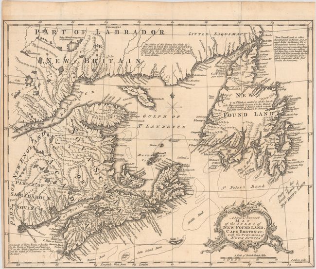 This attractive and detailed map focuses on the region surrounding the Gulf of St. Lawrence. The coasts are lined with place names, and the map delineates the major fishing banks in the Atlantic. It includes some notations, including a couple describing the division of lands between the French and English according to the Treaty of Utrecht (1713). Engraved by John Gibson and published in Andrew Millar’s American Gazetteer.