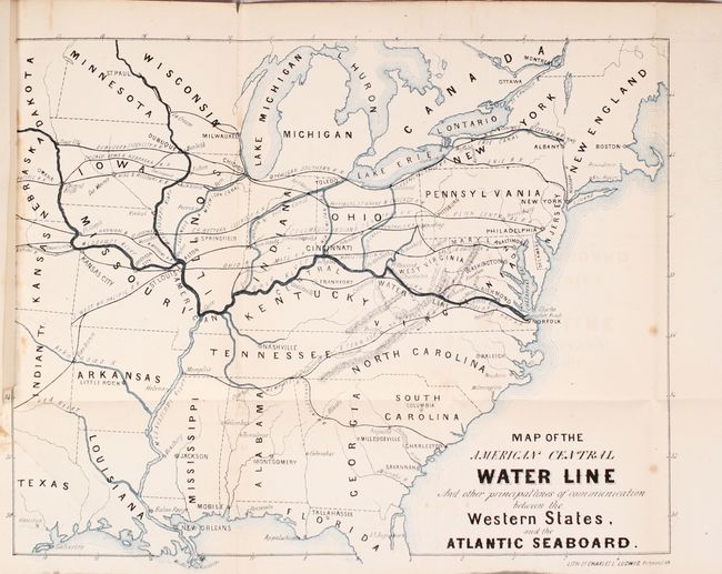This map and report was issued by the James River & Kanawha Company "at the request of prominent citizens of the Western States." It details the need for a water route from the Mississippi River to the Chesapeake Bay via the Ohio, Kanawha, and James rivers. The proposal would have required construction of a 289 mile extension linking Buchanan, Virginia to the Ohio River. The report states that this proposed route would be both cheaper and faster than either railroads or the two other water routes to the Atlantic (via the Great Lakes or Gulf of Mexico). Accompanying the report is a folding map of the eastern United States showing the "American Central Water Line" in dark blue with a number of other railroads and canals depicted in the region. Lithographed by Charles Ludwig in Richmond, Virginia.