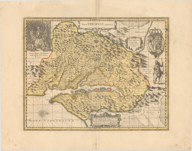 This graphic map is Henricus Hondius' version of Capt. John Smith's important map of 1612, drawn from his brother's map of 1618. After the death of Jodocus Hondius in 1629, his widow sold a number of plates to Blaeu. Angry at the sale to a competitor, Henricus and Joannes Jansson engaged engravers to cut new plates, which were largely based on Jodocus' work. This is the 5th derivative of Smith's map. It is beautifully engraved with topographical features and the locations of scores of Indian villages. In the upper left corner is an engraving of the great Indian chief Powhatan seated on his throne and surrounded by his subjects. A Susquehanna chief, facing in toward Chesapeake Bay (opposite of Jodocus' plate), is depicted on the right under a coat of arms. In 1694, Petrus Schenk acquired all of the plates from the Atlas Major from Jansson's heirs and reissued them with his imprint. This example, with Schenk & Valck's imprint and a blank verso, is very uncommon.