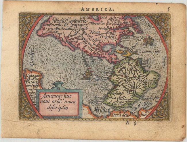 B. Americae sive Novi Orbis Nova Descriptio. This is a reduced version of Ortelius' 1570 folio map of the Americas. The characteristic bulges in the western coastlines of both continents and the huge southern continent are instantly recognizable. Ornamented with two sailing ships and a delicate floral surround. References: Burden #48; Van der Krogt (Vol. III) #9000:331.
