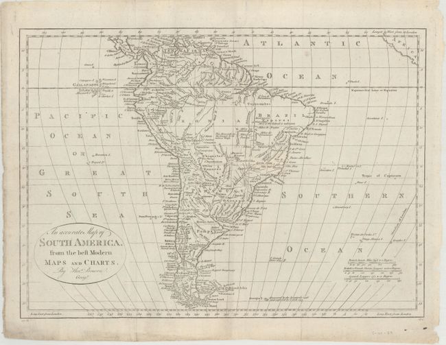 B. An Accurate Map of South America, from the Best Modern Maps and Charts (17.7 x 12.7"). This delicately engraved map of the continent features simple interior topography. The map is full of place names and locates many native tribes. The interior is mostly blank with some notes of waterfalls and rivers in the Amazon basin. The coastal areas are well detailed, and the Galapagos Islands are noted and named, as well as a phantom island near the southern tip named Peppy's I. Imaginary. Condition: Light extraneous creasing with a few edge tears that have been closed on verso with archival tape. (B+)