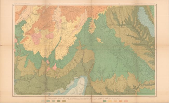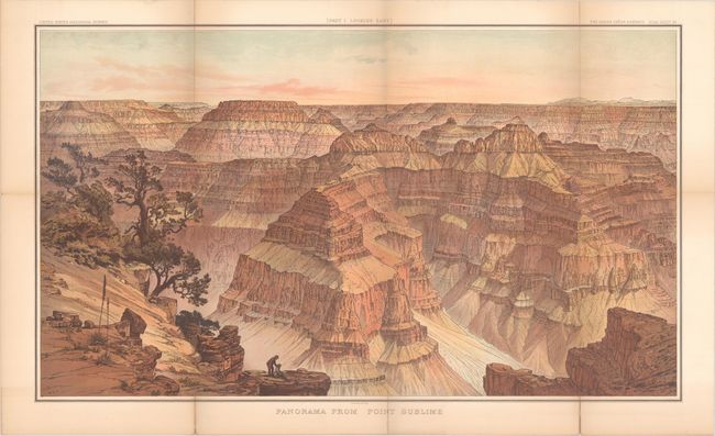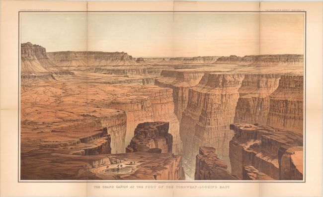 This is the complete quarto edition of Dutton's famous atlas of the Grand Canyon, which is one of the most important works on the region ever produced. It is best known for the stunning illustrations by William H. Holmes and Thomas Moran. Holmes' impressive Panorama From Point Sumblime is shown on three separate sheets (Sheet XV, XVI and XVII) and creates a striking 270 degree panorama of the Grand Canyon (East-South-West). Sheet XVIII, The Transept, Kaibab Division, Grand Canon An Amphitheater of the Second Order, is based upon the classic painting by Thomas Moran, who is probably the artist most associated with the Grand Canyon. The view itself is of a gorge opening into one of the branches of the Bright Angel Canyon in the Kaibab. In addition to these four important views, there are twelve geologic maps of the region (eleven in color) and six other chromolithographs, a title page and table of contents. Lithographed by Julius Bien & Co.