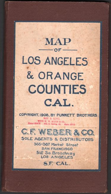 This early and rare pocket map of Los Angeles County and Orange County is printed with blue ink. It shows ranchos, mines, and springs mostly north of the city with railroads, roads, and settlements to the south and east. The map was drawn and published by the Punnett Brothers, and shortly thereafter issued by the C.F. Weber firm, whose imprint is on the front cover as "sole agents and distributors." Folds into quarto brown cloth covers with paper title label. There are no examples of this 1908 edition found on OCLC. For an example of the 1914 version, click here.