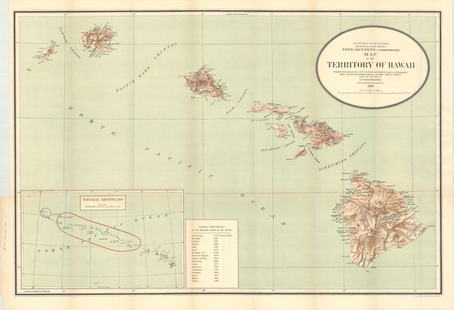 A large and colorful map that was "compiled from data on file in the U.S. Coast and Geodetic Survey: Hydrographic Office: Hawaiian Government Surveys, and other authentic sources under the direction of I. P. Berthrong Chief of Drafting Division." Beautifully colored including lithographic shading to suggest terrain. Published under the direction of the commissioner Fred Dennett. A large inset (12.5 x 7.5") at lower left gives a wider view of the entire archipelago and notes in red the Hawaiian Islands Bird Reservation. A table at bottom center lists the distances to the principle ports in the Pacific Ocean from Honolulu. Good detail on a scale of 1 inch = 12 miles. Blank verso.