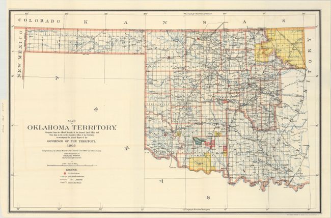This is an updated version of the General Land Office map first published in 1898. It shows the western part of the present state of Oklahoma and also includes a portion of the steadily shrinking Indian Territory. It locates tribal holdings, grazing lands, roads and trails, and railroads proposed and constructed. Army posts Ft. Sill, Ft. Reno, and the Wood Res. are marked in red. Land Offices are located at Woodward, Alva, Guthrie, Kingfisher, El Reno, Mangum, and Lawton.