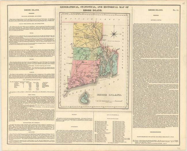 This map was beautifully drawn by F. Lucas and finely engraved by J. Yeager. It shows the state with a population of only 83,000 as compared to today's number of over one million. Five counties are named, and there is an adequate network of wagon roads. Newport, Little Rest, Bristol, Warren, and Providence are shown in a block layout. All of Block Island is shown to the south. Towns and settlements include Tower Hill, Charlestown, East Greenwich, and Pocasset. Among details are a powder mill, the Great Swamp, Perry's Iron Works, as well as turnpikes headed to Norwich, Connecticut, and Pawcatuck. On a full folio sheet (22.0 x 17.8"), the surrounding text gives historical, physical, and political information. A table lists all Governors current to William C. Gibbs, 1821.